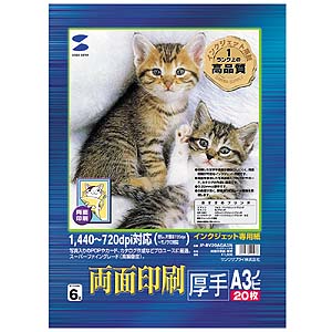 【全品送料無料!⇒2/1(月)AM10:00まで】[在庫あり]インクジェット用紙 スーパーファイングレード つやなし 厚手 両面印刷 A3ノビ 20枚 [JP-RV20AGA3N] サンワサプライ【あ 価格: 1,260円 レビュー評価:0.0 レビュー数:0 文字や画像が裏抜けしにくく、両面印刷が可能な厚手の用紙。(裏表あり)<特長>●印字や画像が裏抜けしにくく、両面印刷が可能なインクジェット専用紙です。●裏表があり、表面は4800?720dpi(超高解像度?高解像度)の出力に、裏面は720dpi(中解像度)からモノクロまで、幅広い画像の出力に最適です。細かい文字もくっきり鮮やかです。●0.22mmと厚みがあるので、写真画像入りのPOP、カード、カタログやチラシの作成に最適です。※一度に連続して大量に印刷を行う用途には向きません。大量に印刷を行う際は、用紙をよくさばき、一度にセットする用紙は10枚程度にしてください。また、用紙が正常に給紙できなくな Supported by 楽天ウェブサービス |